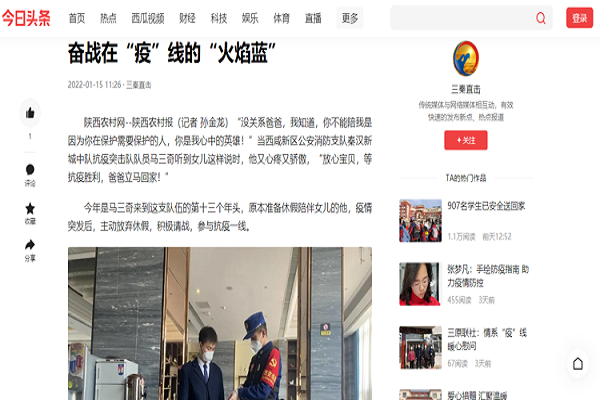 现场出警救援解民困。中国消防官方抖音号以《一群“大白”路遇车祸,现场出警》为题转发西咸消防抗“疫”途中紧急出警救援视频。在陕广新闻开展《西咸消防出警归队全面核酸检测和防疫消杀》直播,搜狐新闻、陕西都市快报分别报道《消防员抗疫途中遇车祸十分钟救出2人#竟是为隔离酒店送餐的志愿者》,话题“大白变身消防员解救出车祸人员”冲上当日抖音同城热搜TOP榜,获356.9万点赞量。