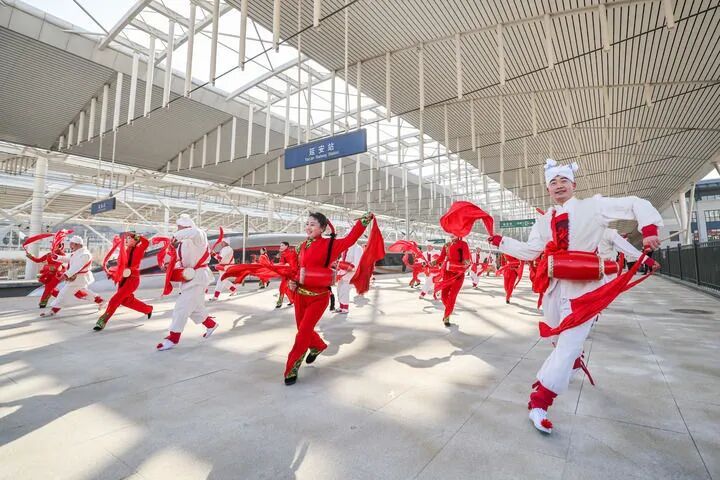 | 2025年12月26日,民间艺人在延安站打起腰鼓,迎接从西安开抵延安的首趟高铁列车。新华社发(刘翔摄) |