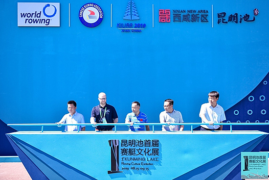 国际赛艇联合会赛事品牌经理麦特·埃文斯,中国赛艇协会副主席陈春新,陕西省水上运动管理中心主任任俊保,沣东新城党委委员、管委会副主任马建昌,沣东新城管委会副巡视员关奎元共同为首届赛艇文化展揭幕。