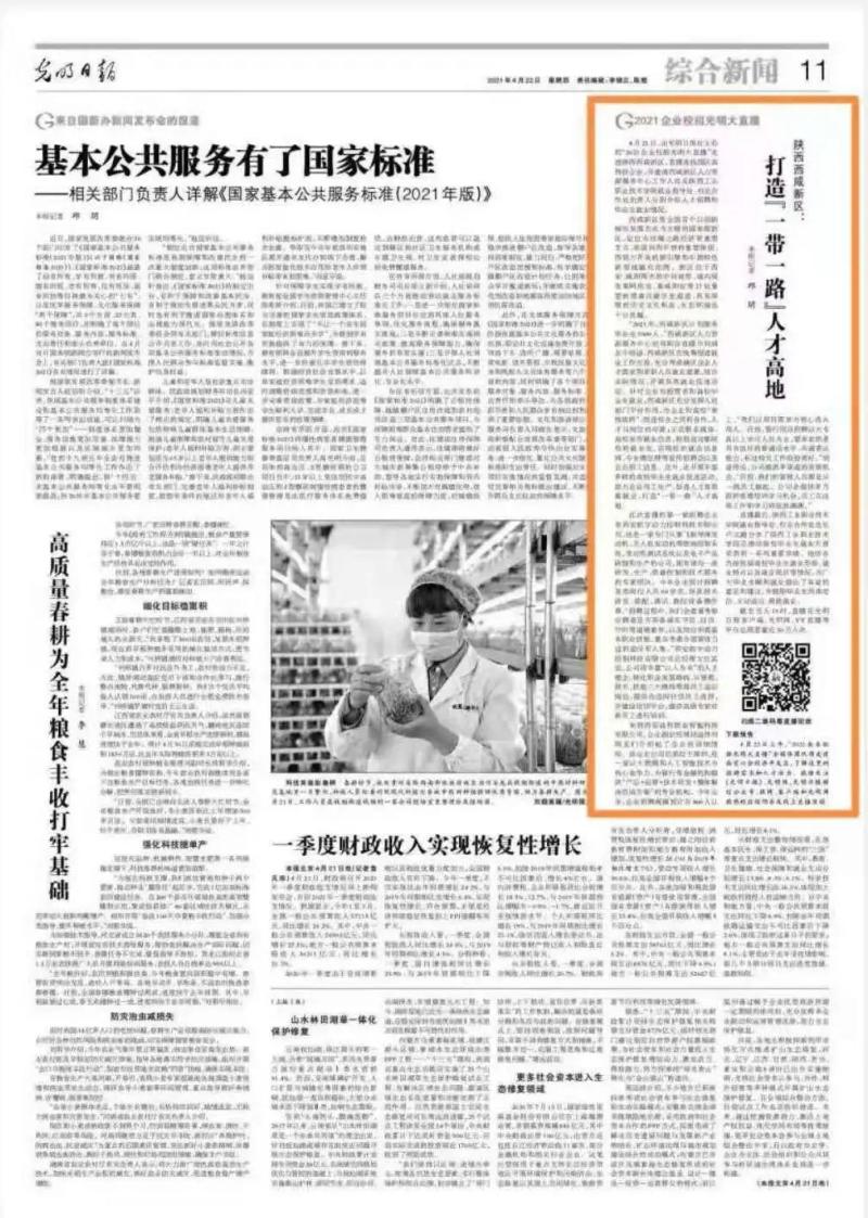 4月22日光明日报刊发《陕西西咸新区:打造“一带一路”人才高地》聚焦新区开展各类就业促进活动,助力企业用工生产促进人才高质量就业。
