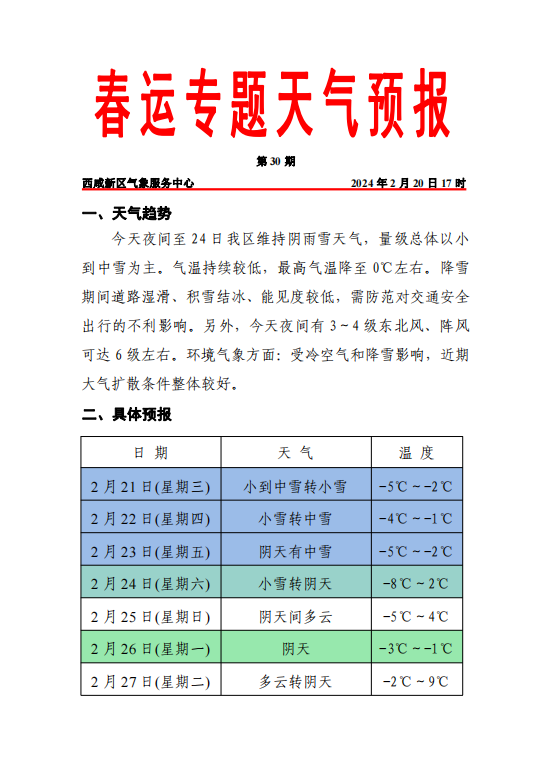 西安市气象台2024年2月20日18时45分发布道路结冰黄色预警信号:目前新区大部分地区出现雨雪天气,部分地区出现冻雨,且路表温度低于0℃,预计今天晚上到明天白天,西咸新区将出现对交通有影响的道路结冰,请注意防范。