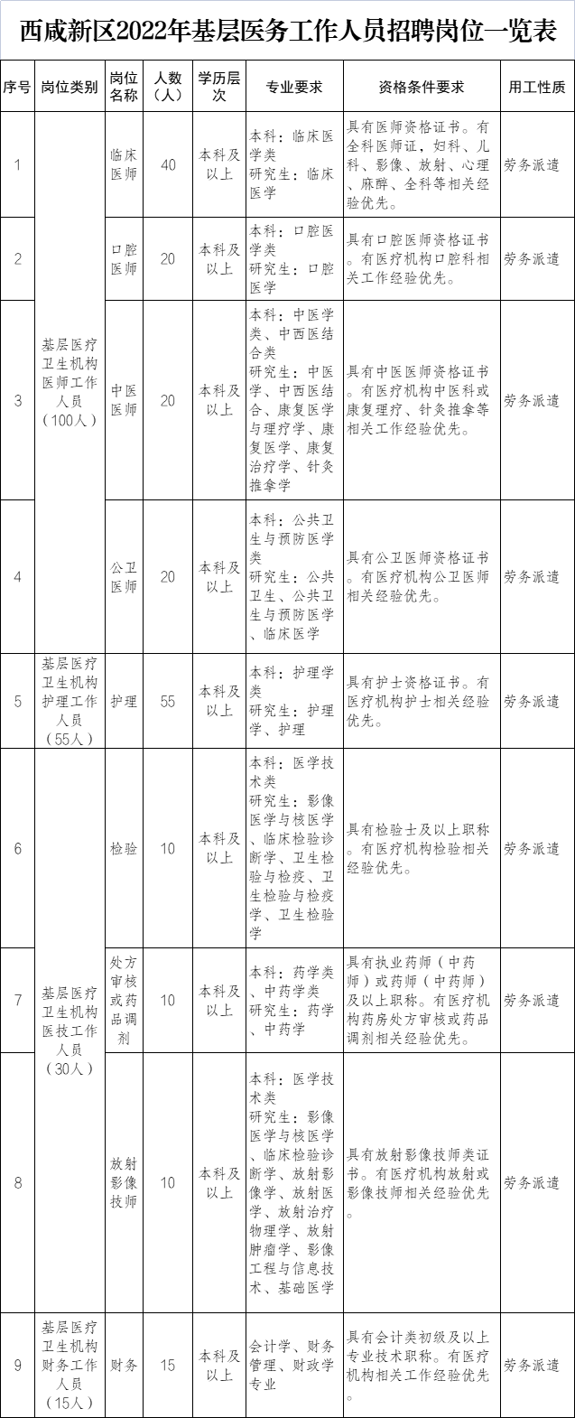 6.应聘人员除符合上述基本条件外,还须符合《西咸新区2022年基层医务工作人员招聘岗位一览表》的岗位任职条件。