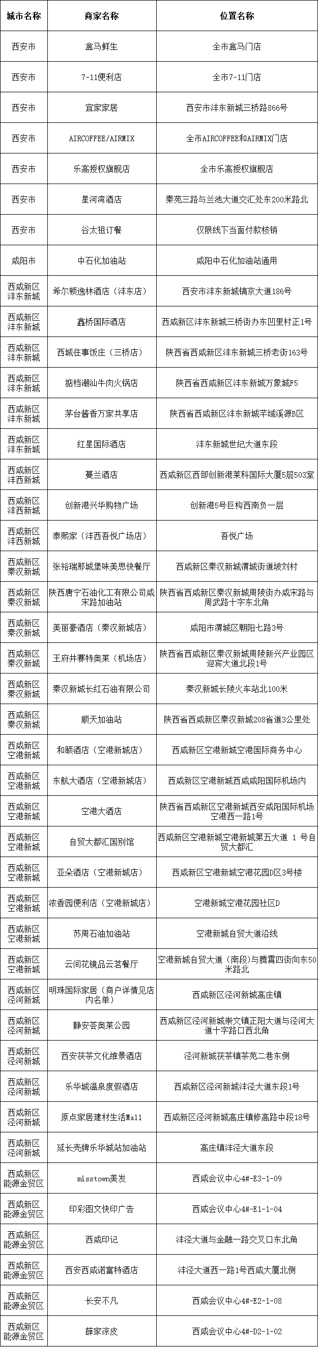 使用范围:西咸新区辖区重点餐饮零售商家,西安市盒马鲜生、盒马奥莱门店,宜家家居,711便利店,咸阳市中石化加油站等(具体名单附后)。
