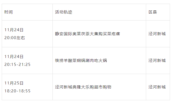 现有新冠肺炎阳性病例曾于11月21日至11月24日在以下4处点位有活动轨迹,请与以下轨迹有交集的人员立即主动向属地疫情防控部门、社区(村)或单位报告,停止外出活动,在原地(或居家)等候,严格做好个人防护,并配合落实相关管控措施。