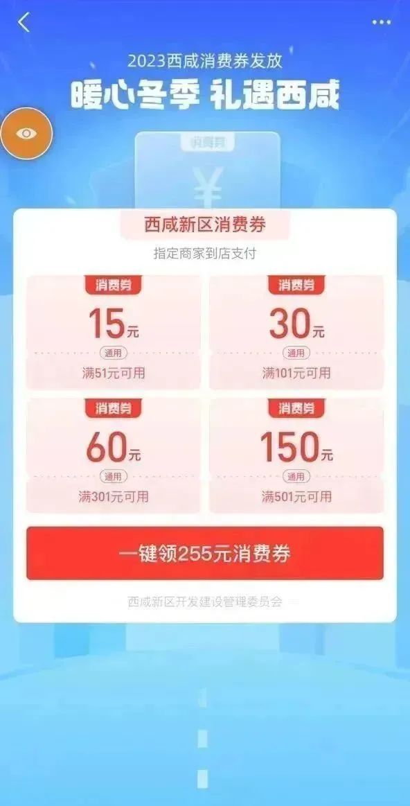 2023年1月16日-2月12日,西咸新区联合支付宝共同打造“暖心冬季礼遇西咸”活动,面向西安、咸阳两地消费者发放500万元消费券用于零售、餐饮、旅游到店消费补贴。