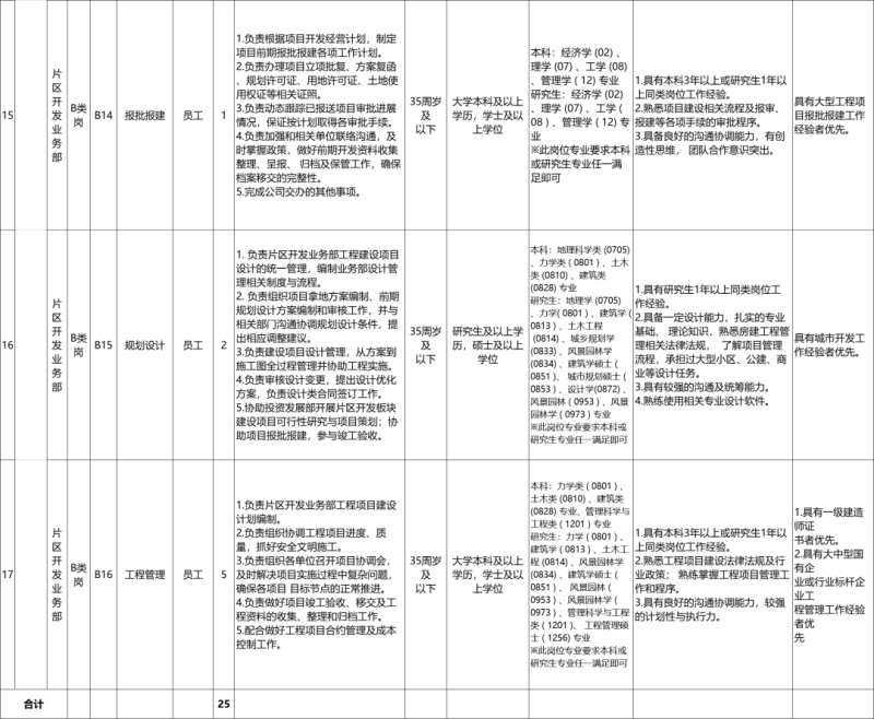 本次招聘共涉及西咸城乡集团本级及子公司17个岗位共计25名人员。具体岗位职责及岗位任职条件详见《西咸城乡集团2023年社会公开招聘需求一览表》。