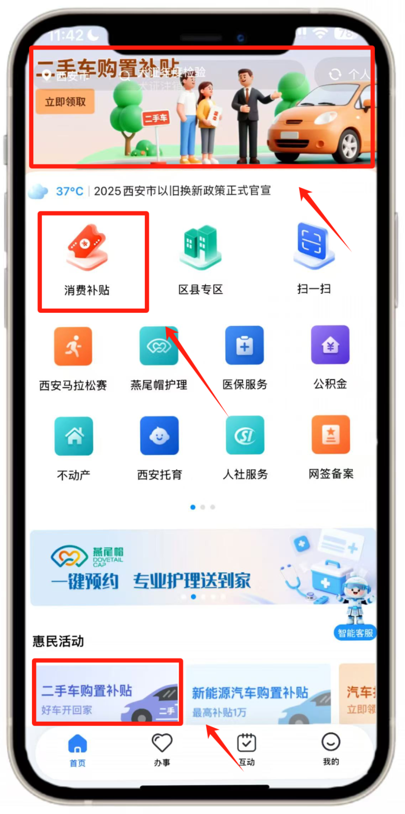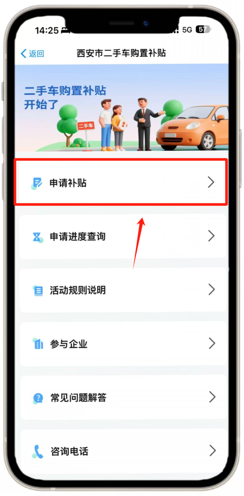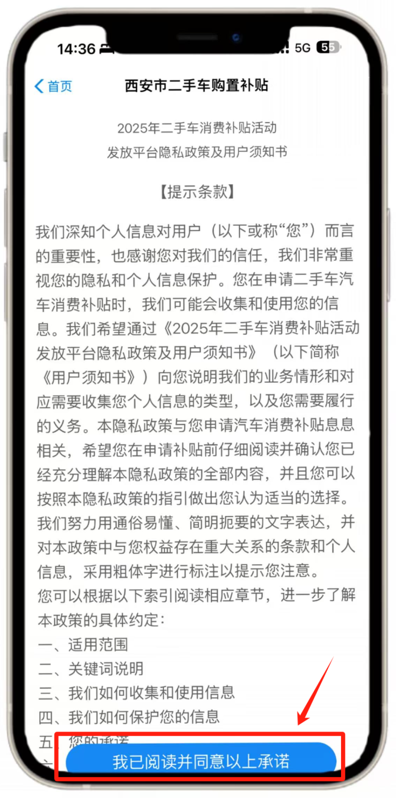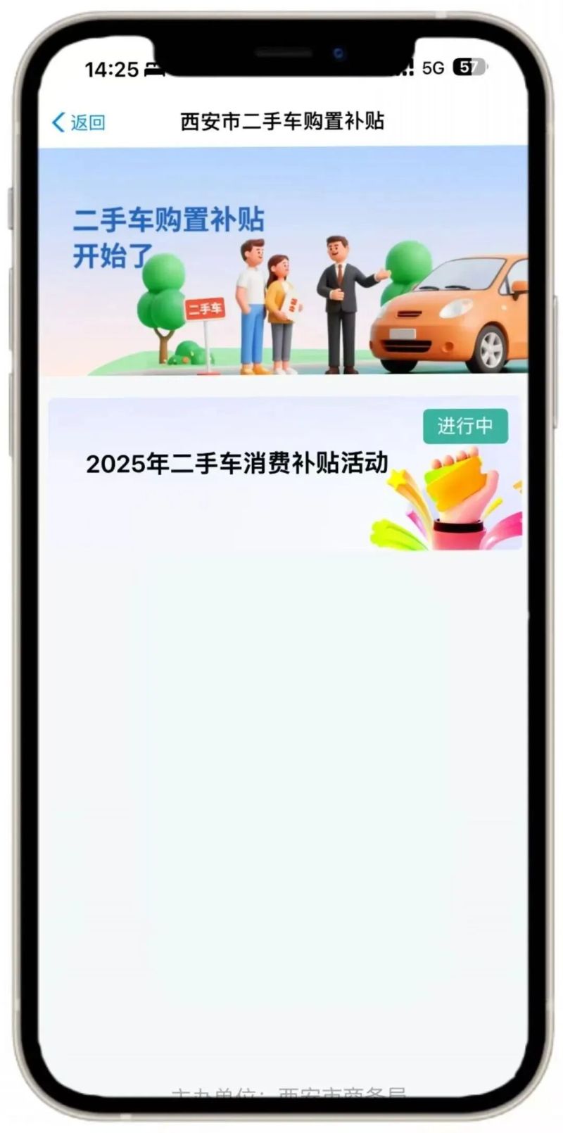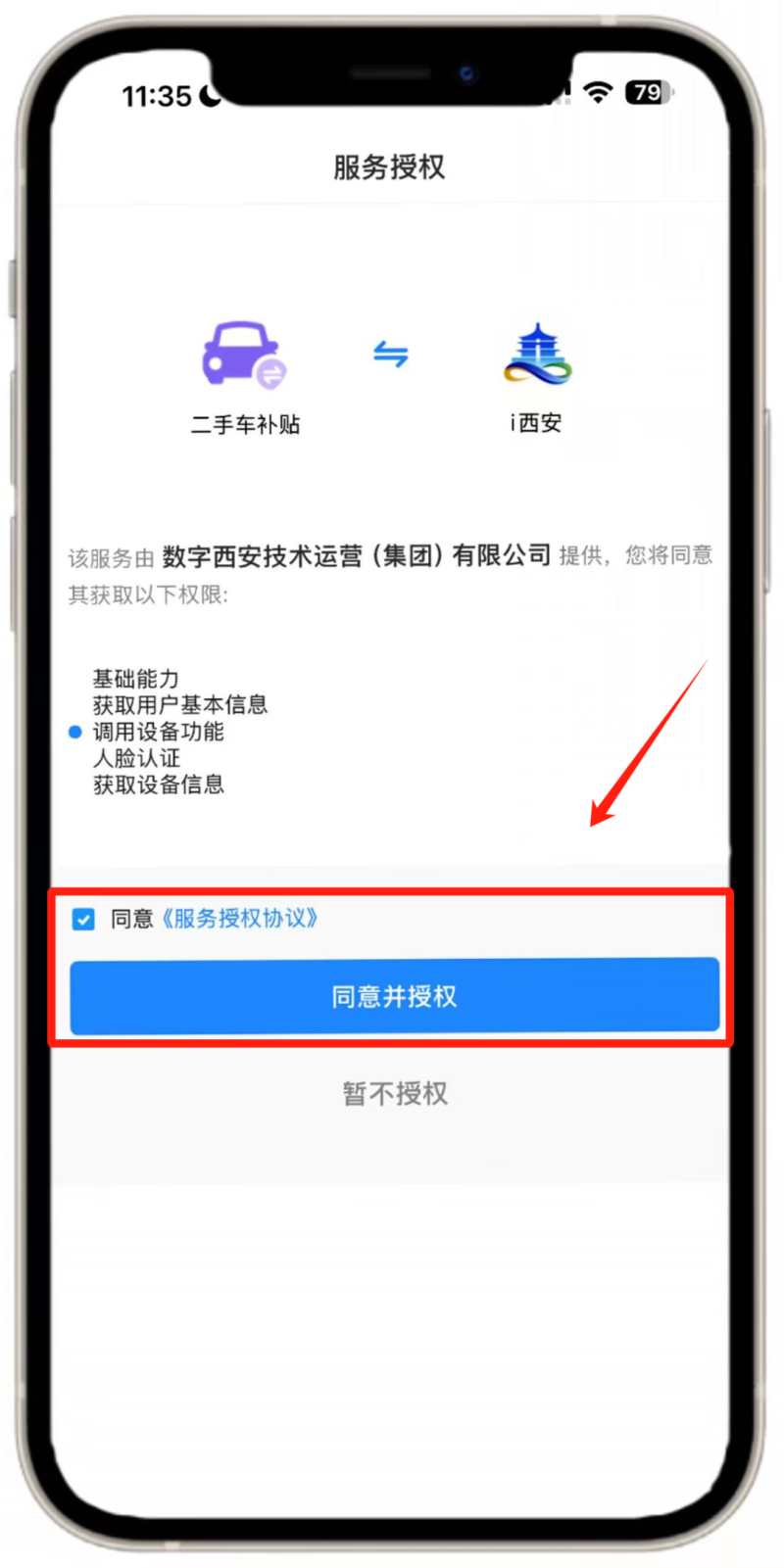 在【首页】点击轮播图【二手车购置补贴】或下方图标,点击【同意并授权】进入活动页面。