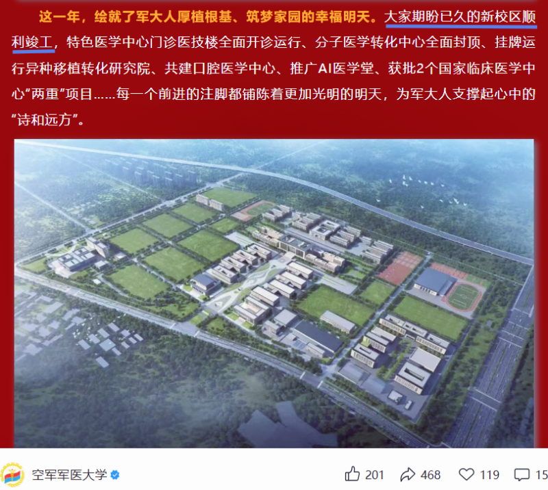 ●“空军军医大学2026年新年献词”带来最新消息:“大家期盼已久的新校区顺利竣工”。