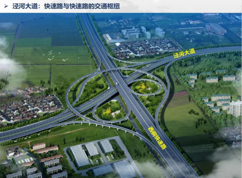 东西向有四条干道——原点大道、高泾大道、泾河大道、沣泾大道,从南到北横向分布,将整个泾河新城网格化分割,并通过泾河、沣泾大道与沣东、沣西、咸阳、空港等区域实现横向联动。