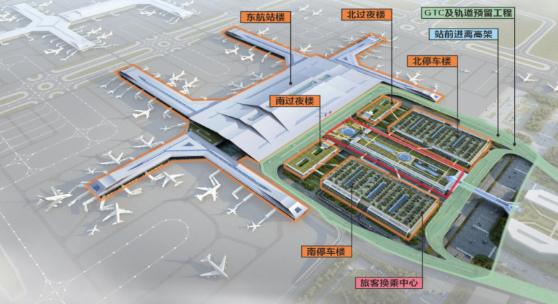 此外,空港新城同步规划核心区近1.4平方公里的T5站前商务区,总投资65亿元。目前,进出场高架桥、复合立交、地下环隧、地面道路等已完成总工程量的50%,凌云国际、航投大厦等项目已建成投运,凯悦酒店、机场信息中心、商业综合体、科技人才成果转化中心等项目正在加速建设。T5站前商务区计划与T5航站楼同步投用,打造集高端商务配套、城市风貌展示、丝路人文交流于一体的“世界航空都市之眼”“国家中心城市地标”。