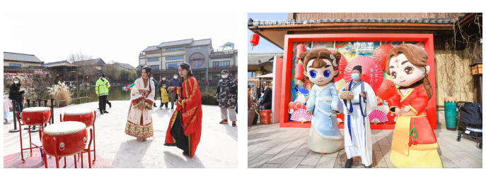 在西安诗经里小镇,传统民俗热闹上演,诗词挑战,雅趣投壶等互动项目丰富有趣,给游客带来丰富的文化体验。