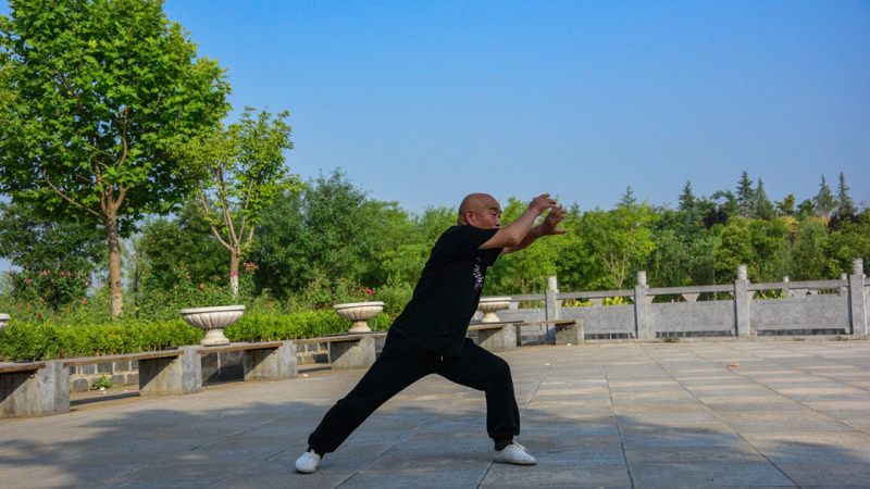 转头来到公园的另一边,王大爷正在踢腿练功。他身形精瘦,轻轻松松就能把腿尖踢过头顶,坐在树荫下休息的“观众团”露出赞许的目光。待他练罢,旁边的大爷也纷纷亮出绝活:程大爷的拳法行云流水,聂大爷的拳法刚劲有力,汤大爷的刀法凌厉迅猛……看得人眼花缭乱。