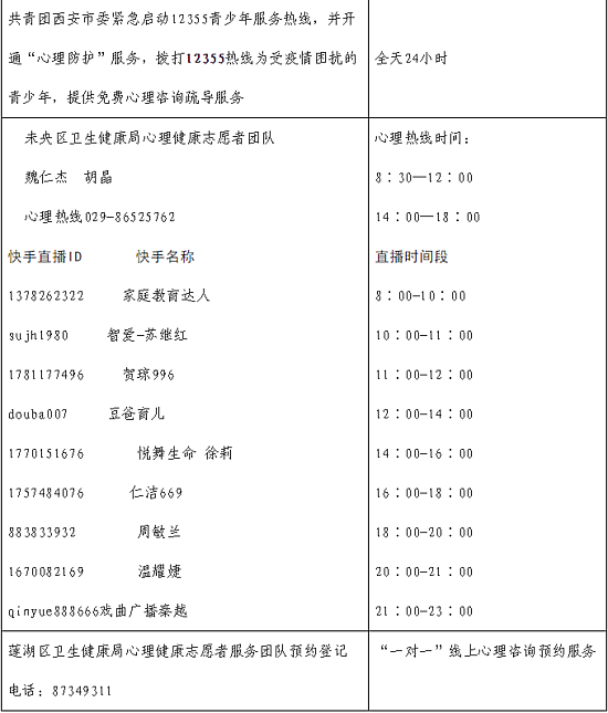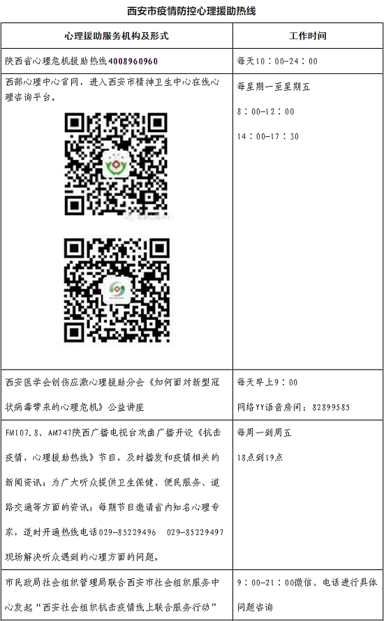 疫情防控期间的心理援助服务正在逐步丰富,此次通过民政、社会组织、医学会等招募了大批心理健康志愿者团队,为公众开展团体和一对一的电话咨询、微信咨询,依托自媒体进行快手直播、视频讲座、电台热线等多种服务形式(附西安市疫情防控心理援助热线一览表),增强了心理健康服务的可及性。即日起市民如有需要可拨打热线或借助新媒体获取相关心理健康服务。