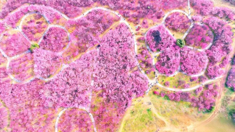 园区观景高地:园区高处的观景区域,可俯瞰整片梅园,梅花连成粉白花海,阡陌小路穿插其间,航拍视角下是壁纸级美景。
