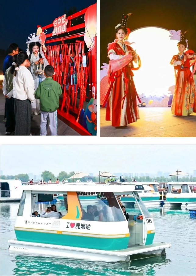 昆明池则将传统文化融入互动体验环节。活字印刷体验区,小朋友们亲手刷墨、拓印,一幅幅墨香四溢的古典诗词跃然纸上;掐丝珐琅书签创作区,游客自由搭配色彩,在方寸书签上涂色作画,领略传统工艺的独特魅力。中秋节当天,亲手制作月饼、灯笼成为最受欢迎的项目,小朋友在家长带领下,把“思念”藏进节日信物,沉浸式感受中秋仪式感。夜晚,国风舞蹈伴着古典音乐翩然上演,搭配超大“月亮剪影”装饰与灯谜竞猜活动,营造出“月圆人团圆”的温馨氛围。