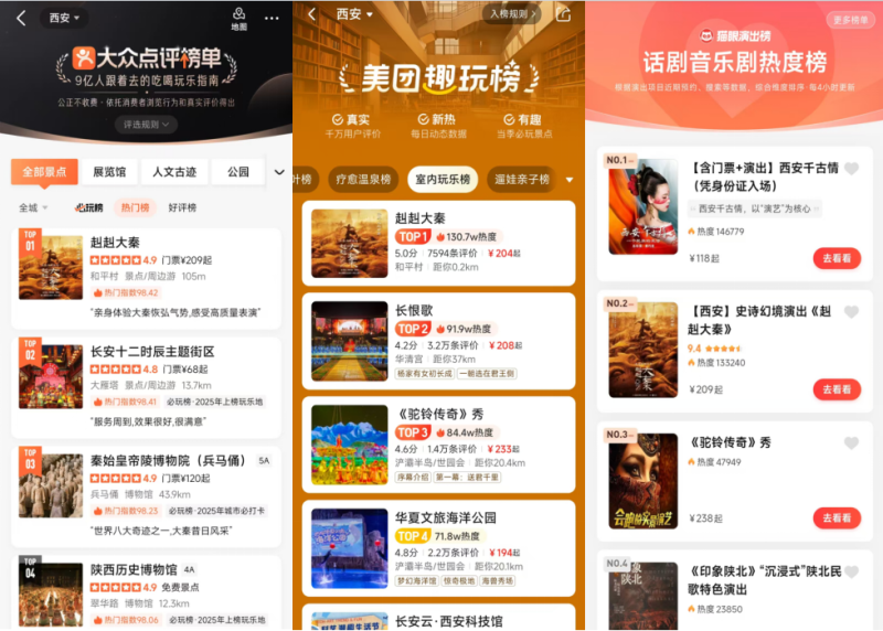 《赳赳大秦》作为秦文化演艺标杆,凭借深厚文化底蕴与创新艺术表达,假期累计接待观众3.3万人次,同比增长51%,22场演出座无虚席,并相继登顶大众点评西安景点热门榜、美团室内玩乐榜,位列猫眼话剧音乐剧热度榜第二。