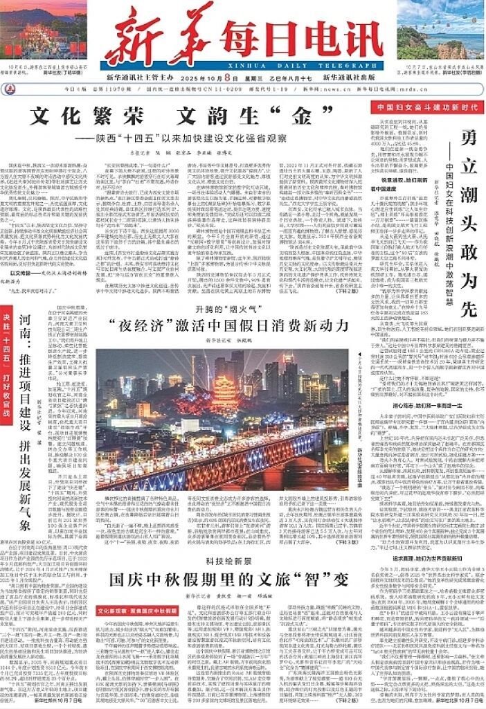 10月8日,《新华每日电讯》头版头条刊发《文化繁荣 文韵生“金”——陕西“十四五”以来加快建设文化强省观察》,其中以陕历博秦汉馆、《赳赳大秦》演艺等为例,报道陕西持续推动丰厚文化资源赋能经济社会高质量发展的生动实践。